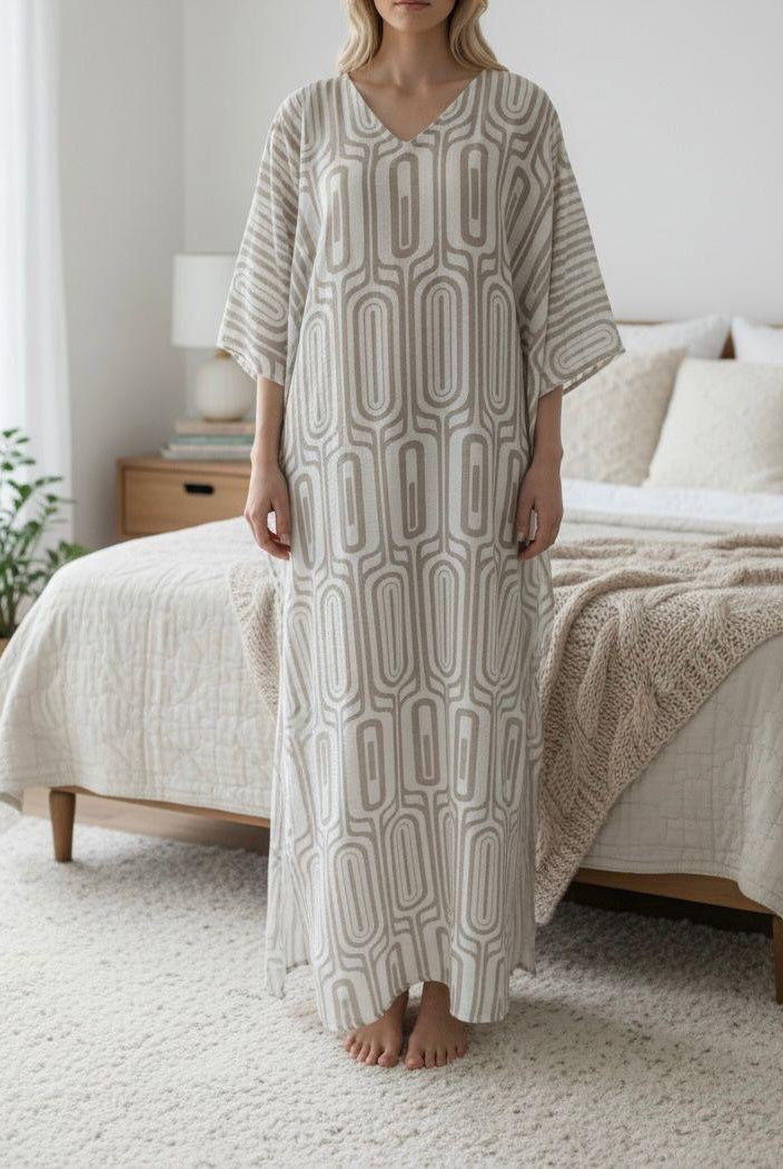 Ladies Beige Flower Print V Neck Gown