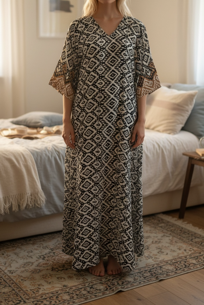 Ladies Black Flower Print V Neck Gown