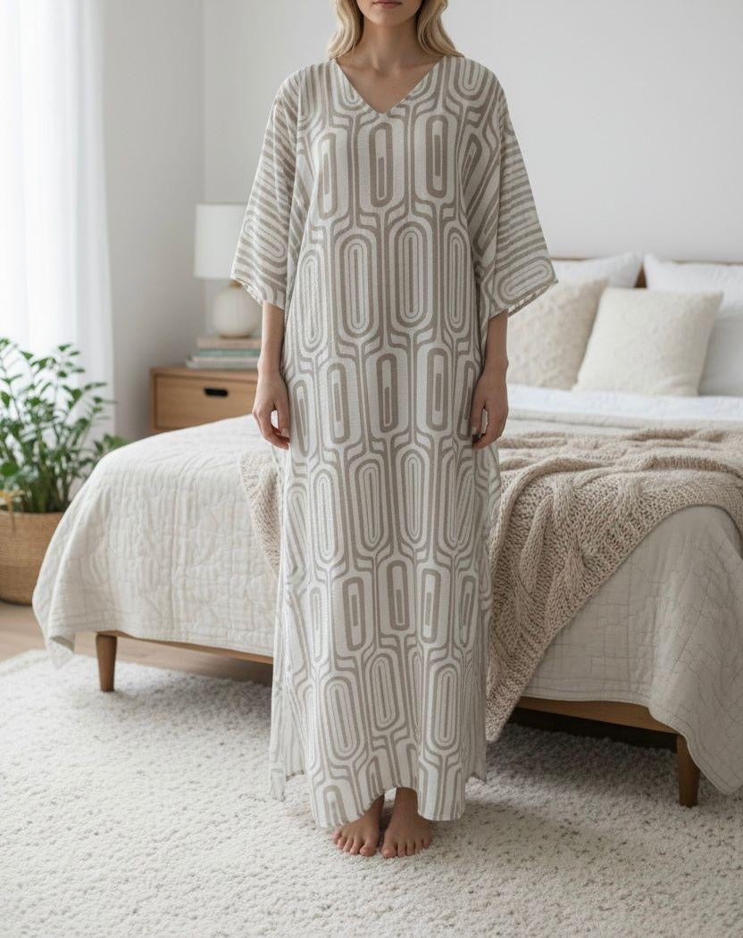 Ladies Beige Flower Print V Neck Gown