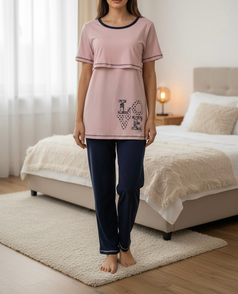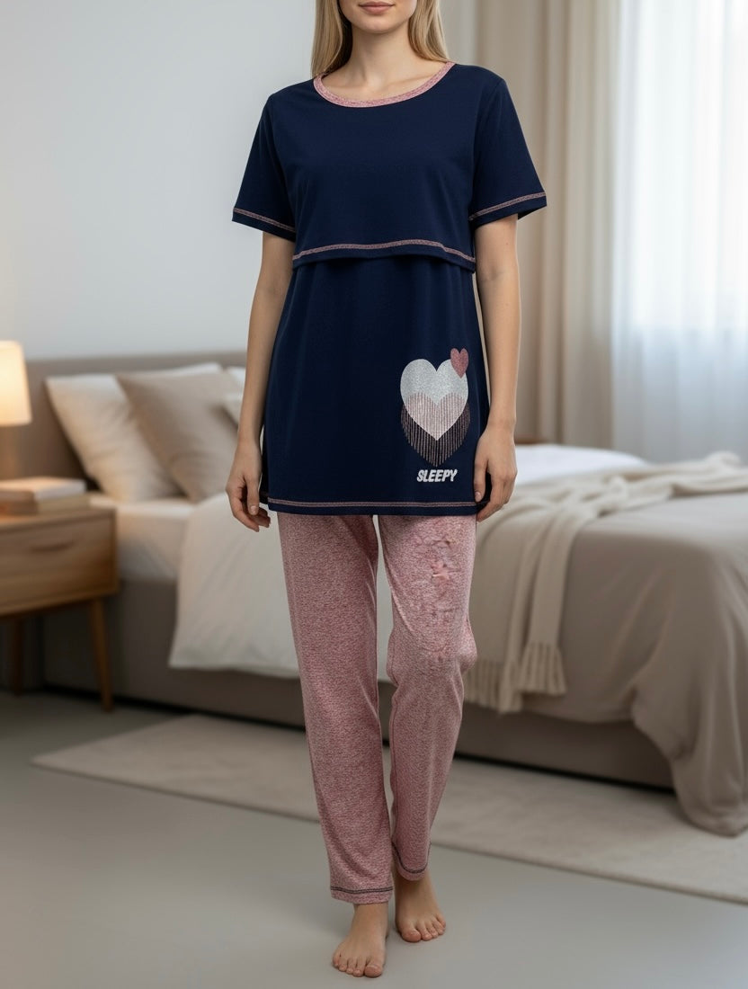 Ladies Navy Breast Feeding Heart Print Pyjama