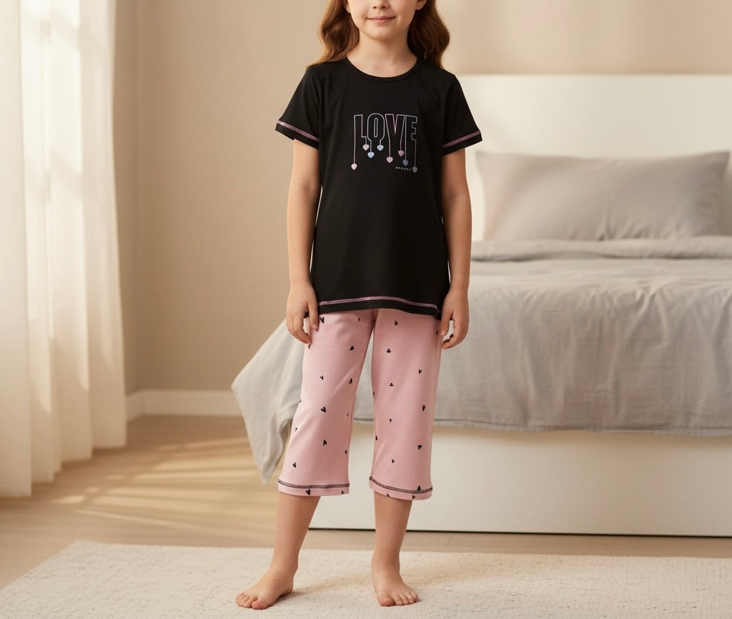 Girls Souk 3/4 Black Love Print Pyjama