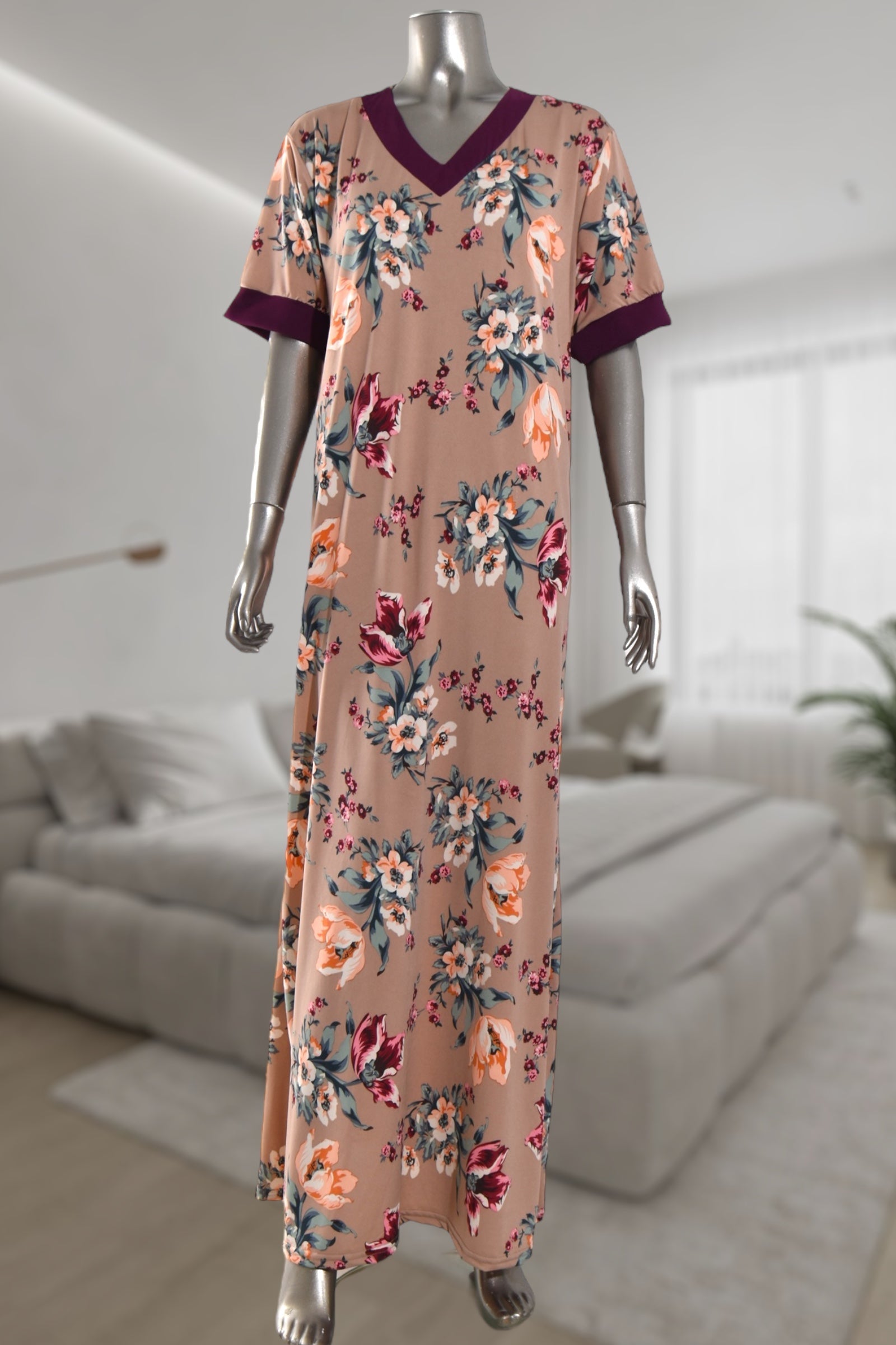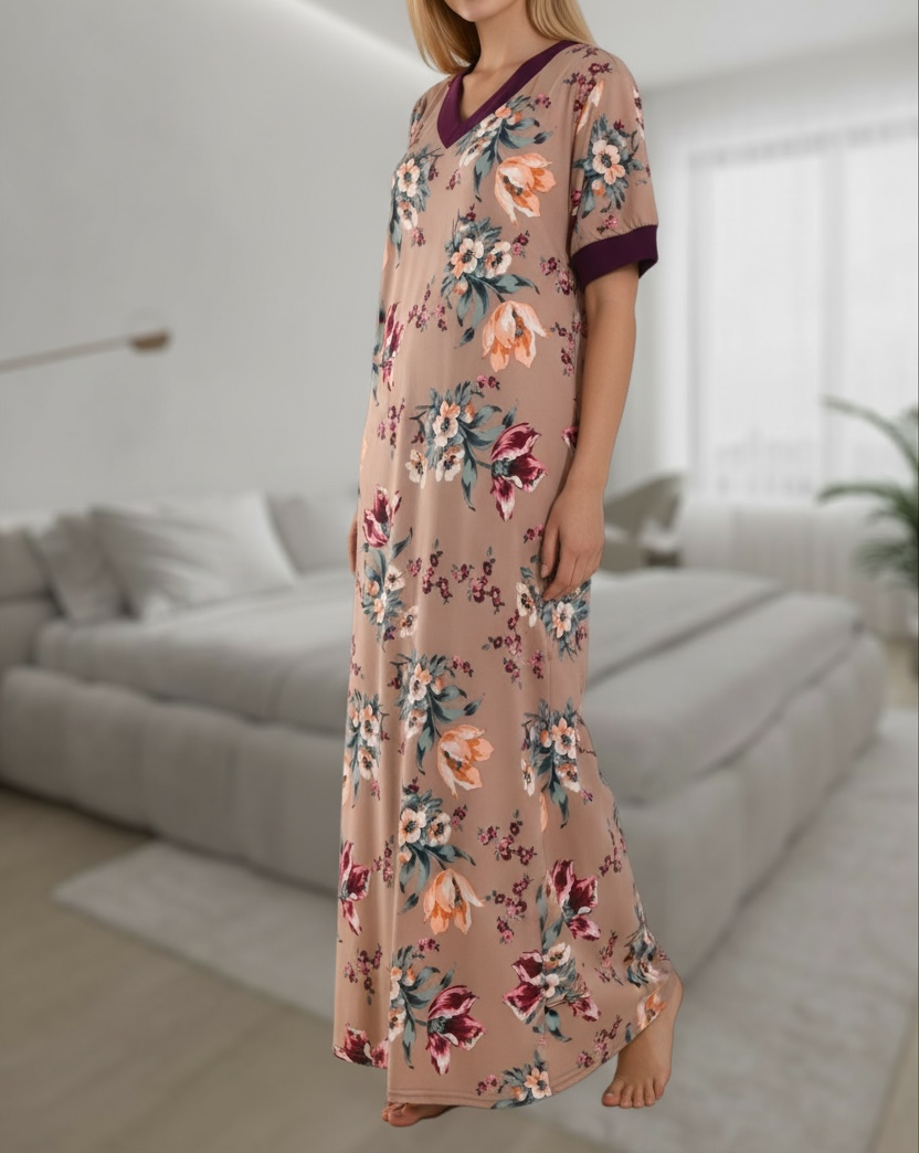 Ladies Beige Flower Print V Neck Gown