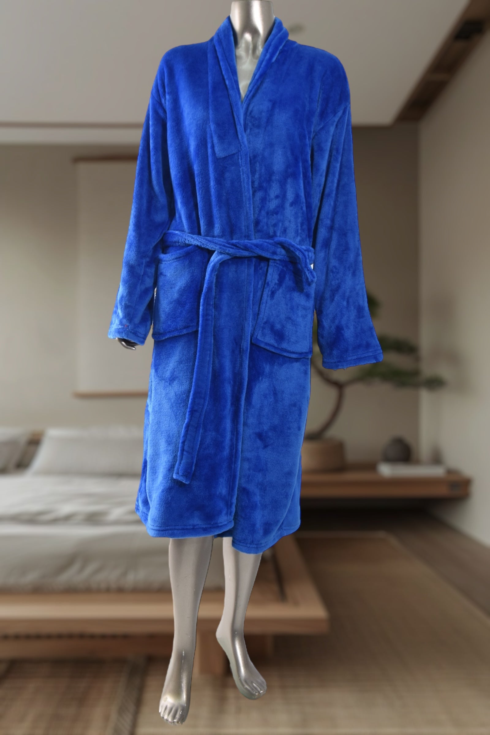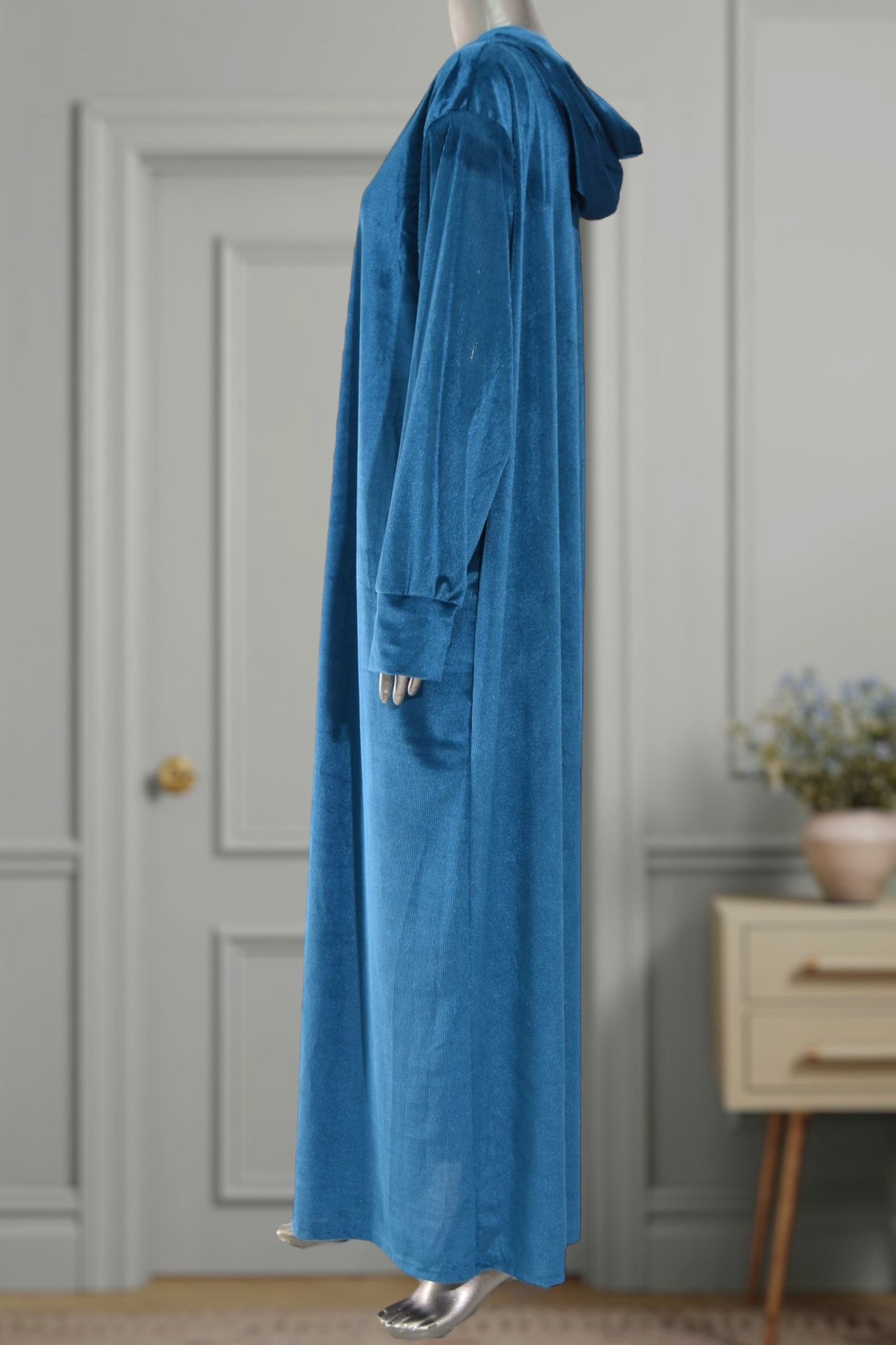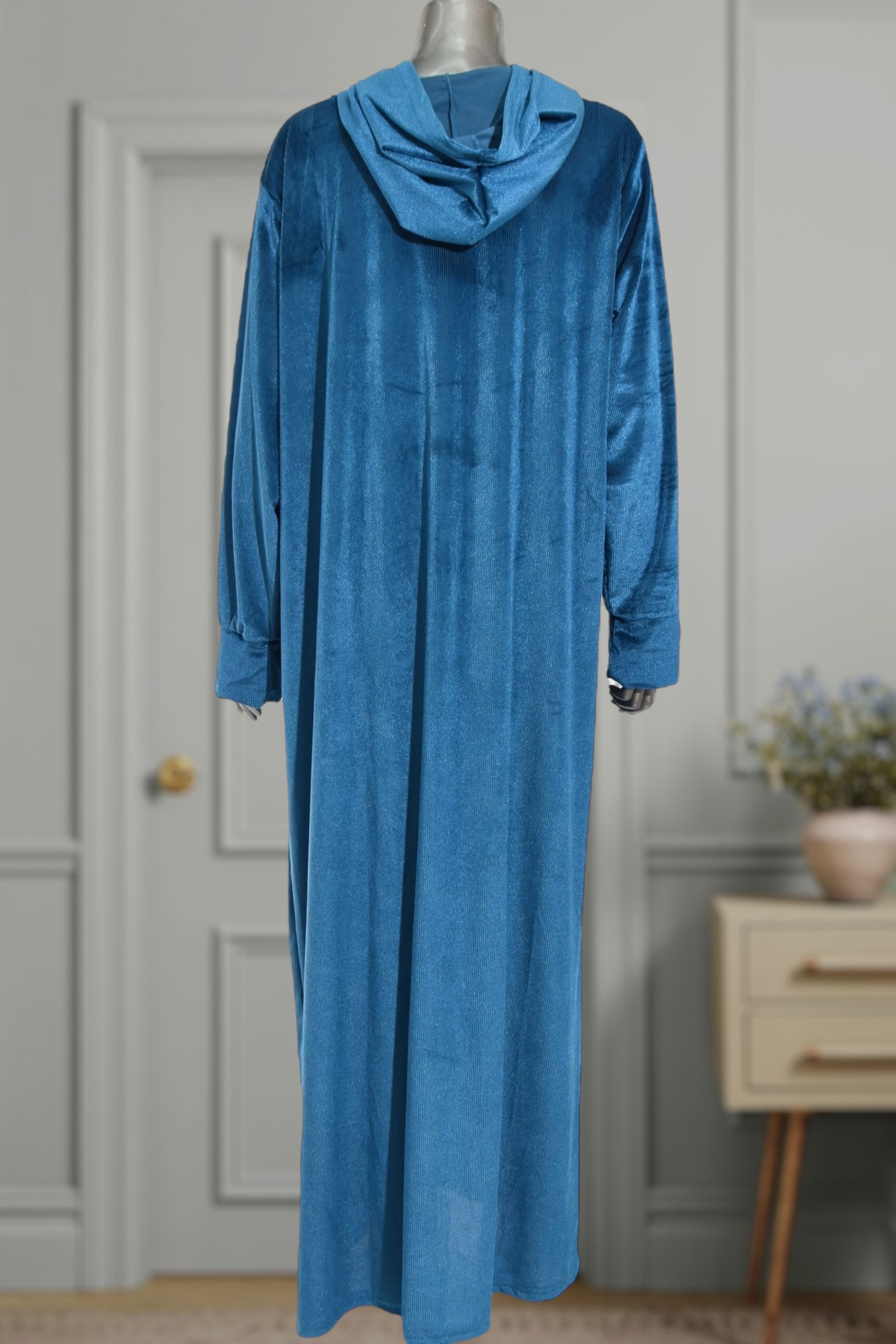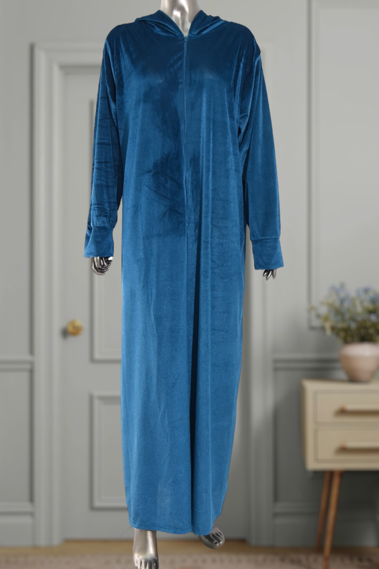 Ladies Velour Zip Gown with Pocket And Hoodie - Blue