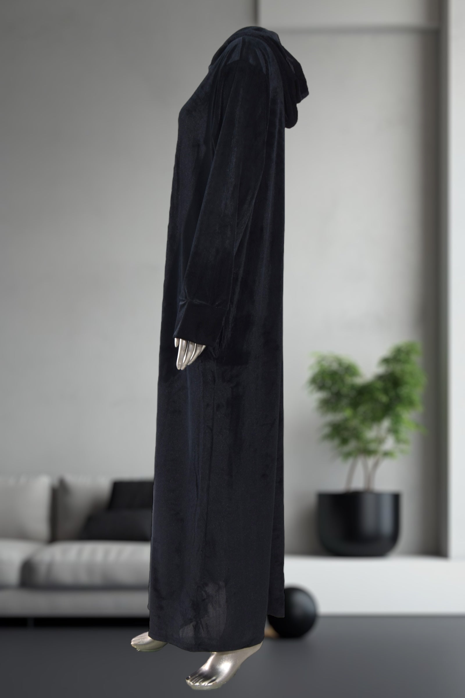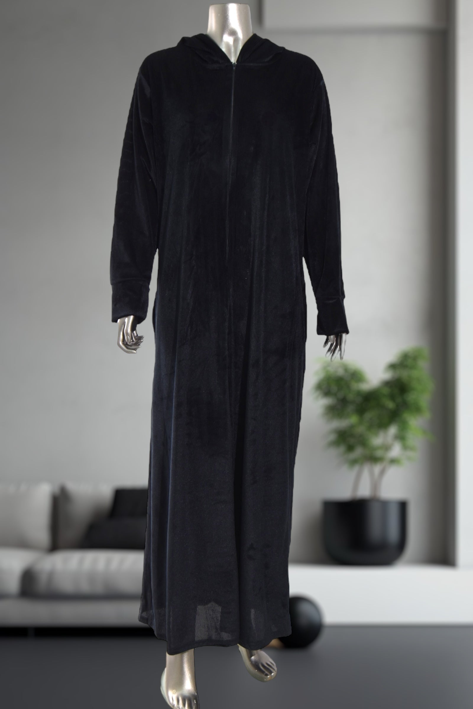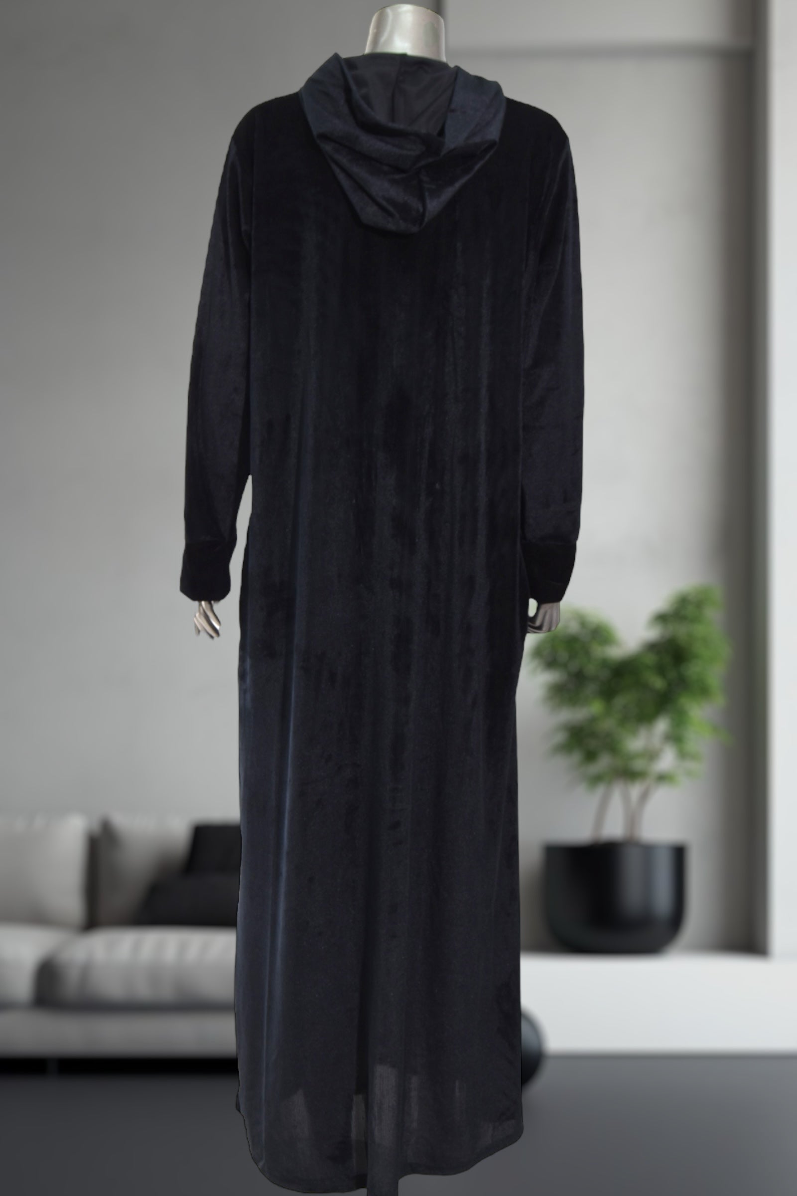 Ladies Velour Zip Gown with Pocket And Hoodie - Black