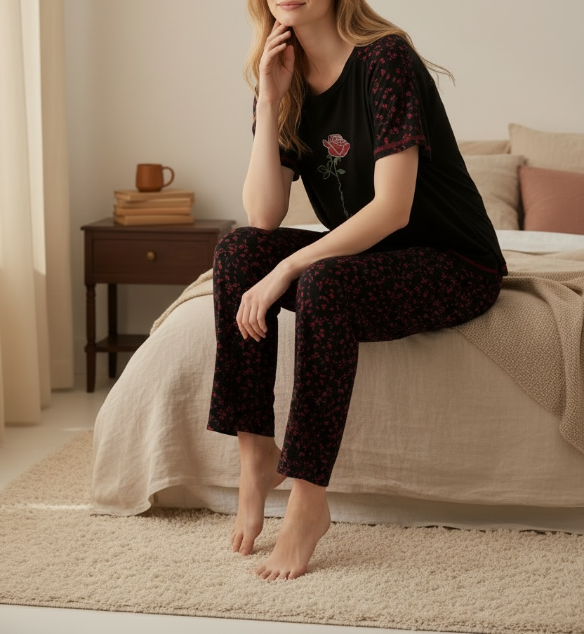 Ladies Black Rose Print Pyjama