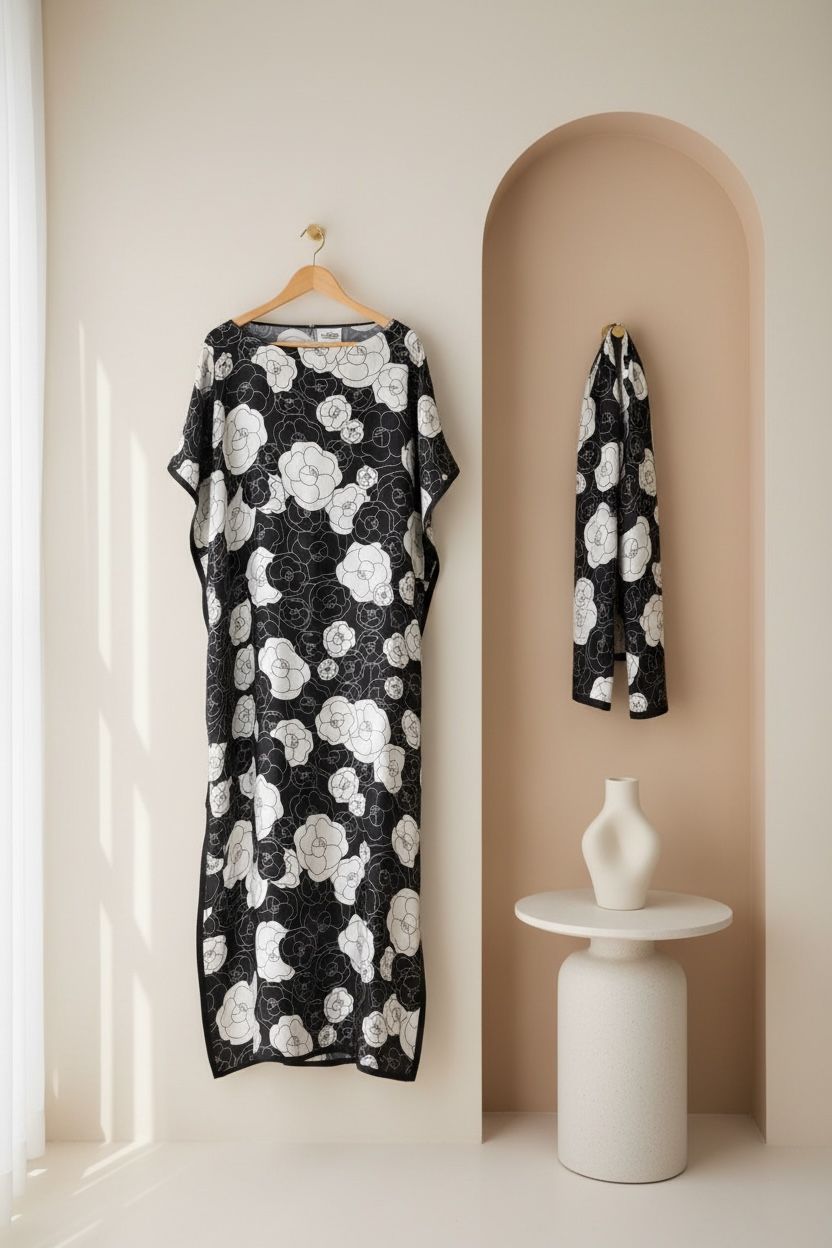 Ladies Souk Black & White Flower Print Gown With Scarf
