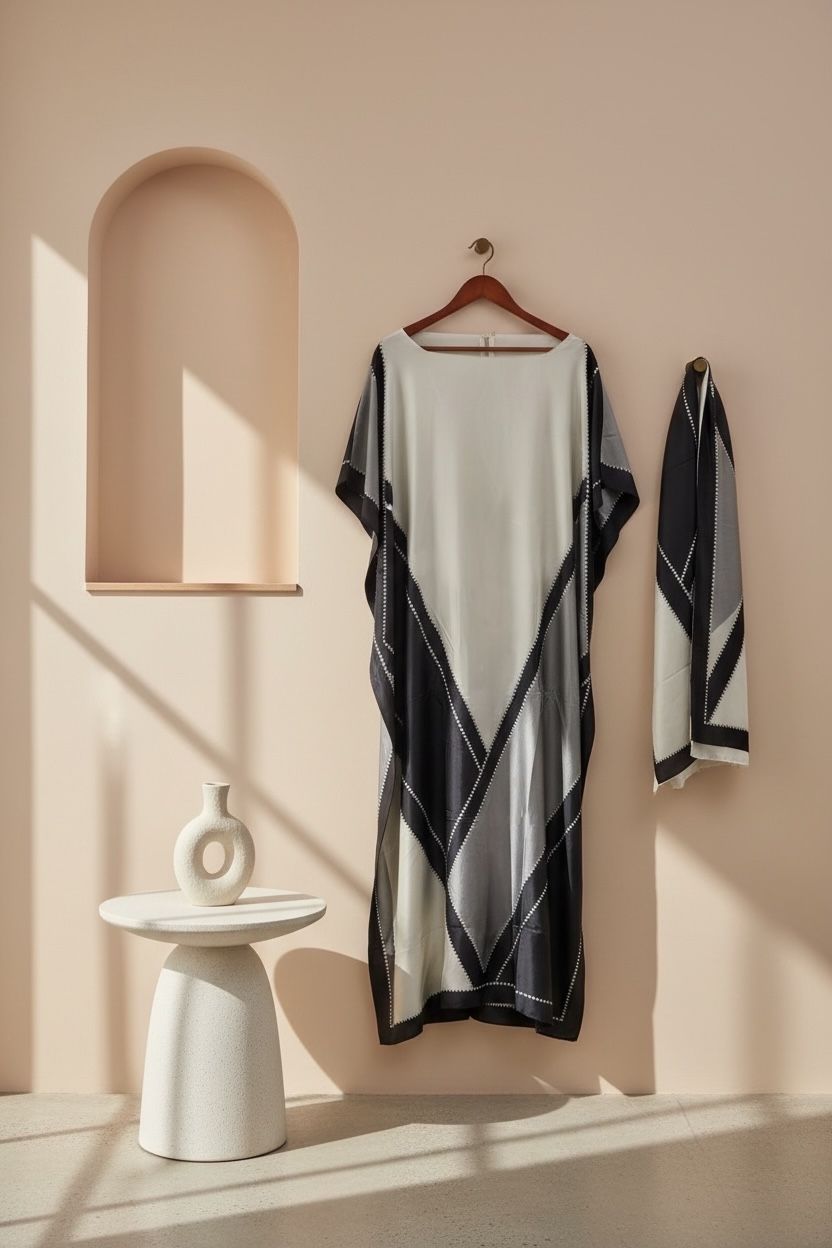 Ladies Souk White & Black & Grey Gown With Scarf