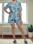 Ladies Blue Flower Print Button Down Shorty Pyjama